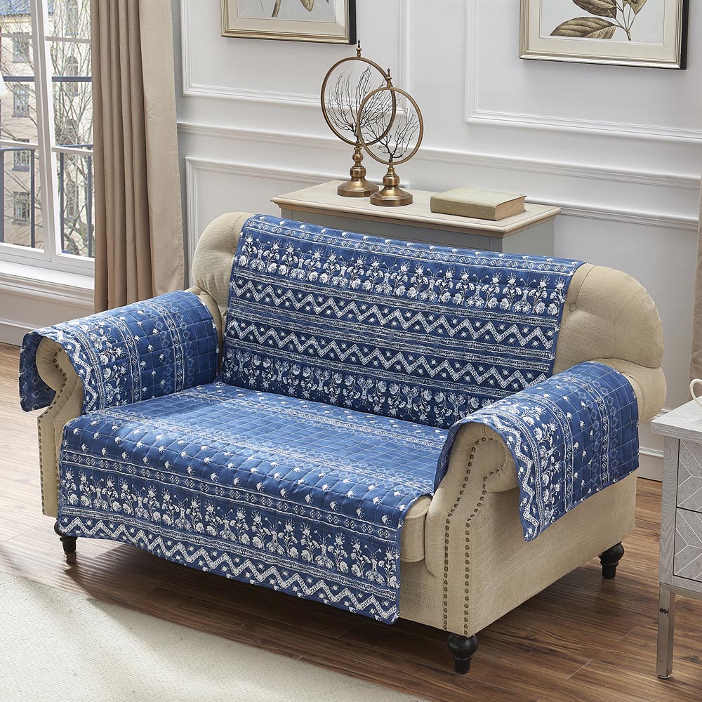 Relax in the deep indigo splendor of this bohemian slip cover. Soft and comfortable with a painterly artisan vibe and romantic feel, the slipcover reverses to a complimentary geometric print. Reversible furniture protector features a coordinating print for two looks in one and includes an elastic strap to hold protector in place on your furniture. Dimensions: Armchair Protector 81×81 inches; Loveseat Protector 103×76 inches; Sofa Protector 127 inches x 77 inches; all dimensions +/- 2 inches. 100% polyester. Machine washable.