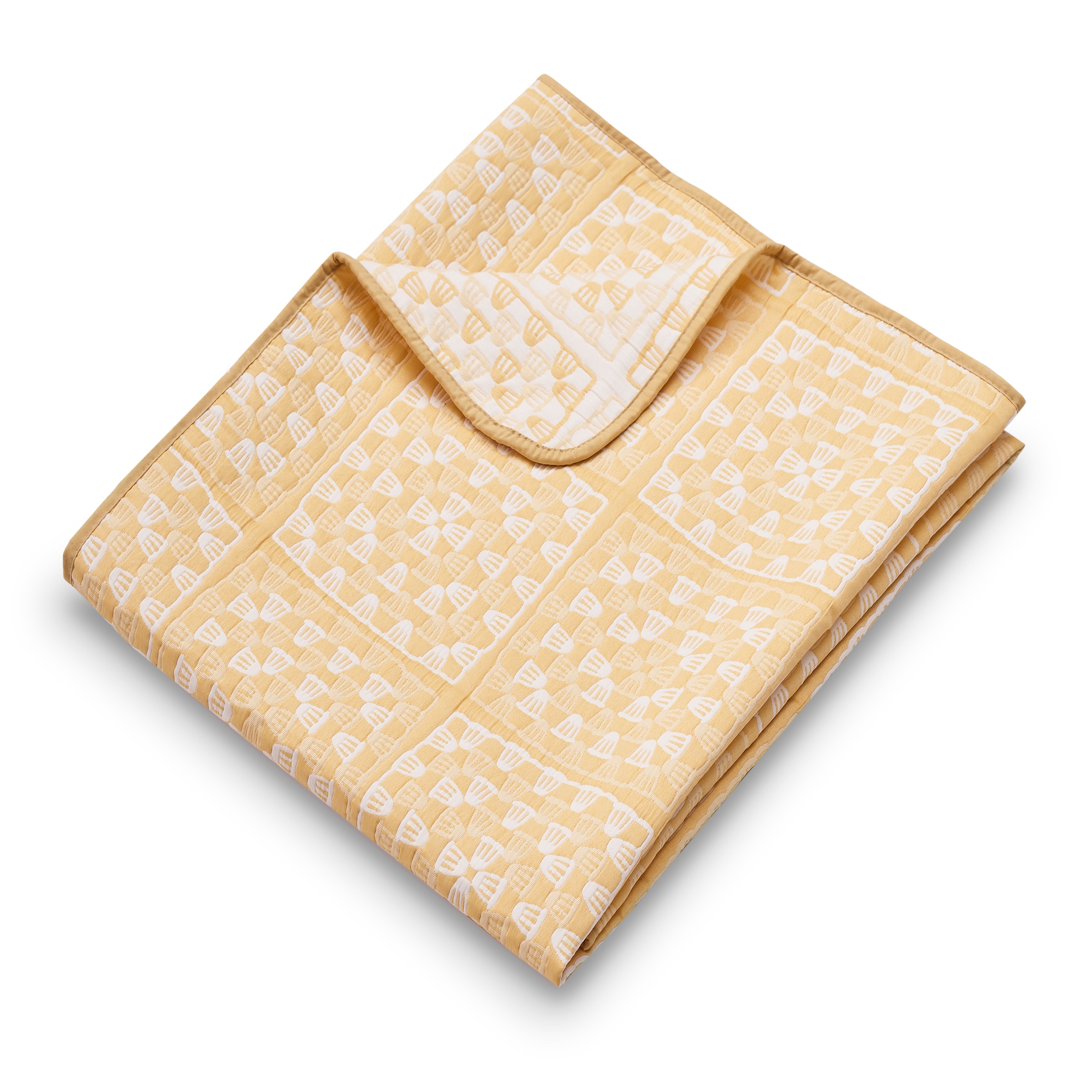 Bring joyful vintage character to your home with the Granny Squares collection, a woven tribute to the crochet squares that defined an era. The repeating pattern offers a modern take on a beloved classic, presented in a sunny gold-and-white palette and fully reversible for added value. Capturing the iconic 1960s aesthetic in a clean, modern woven design, Granny Squares offers lightweight comfort, rich jacquard texture, and effortless machine-washable care. Perfect for anyone who loves retro style with a fresh, modern twist.