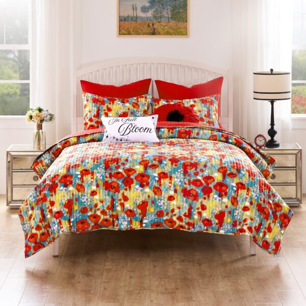 Add a burst of color and artistry to your bedroom with the Poppies Quilt Set. Featuring a modern floral design with a painterly, watercolor effect, this vibrant bedding captures the beauty of a wild poppy field in full bloom. Shades of red, blue, and green come together in a cheerful, contemporary print that brings fresh energy to any space. The quilt and pillow shams reverse to a bold solid red for a striking alternative look. Perfect for boho, cottagecore, or modern farmhouse styles.