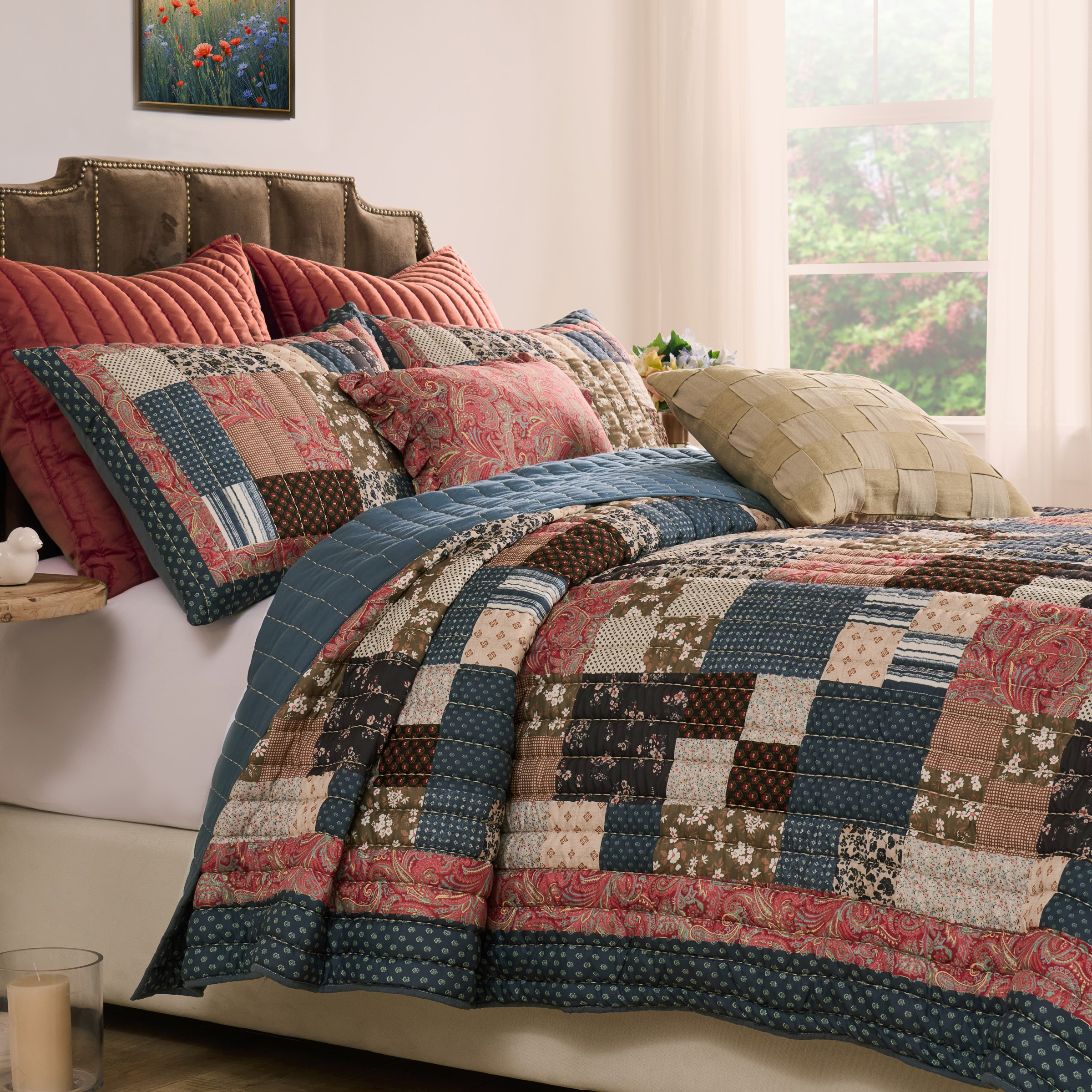 The Shiloh Quilt Set combines the artistry of patchwork with the ease of a printed design. Its intricate mix of floral, geometric, and paisley motifs in harmonious blues, pinks, and neutrals creates a look that’s as inviting as it is timeless. A decorative border frames the design, while decorative quilting in thick yard adds rich texture and the look of hand-stitching. The quilt reverses to a solid blue for versatile styling. Crafted with a breathable cotton face, silky microfiber back, and a cozy down-alternative polyester fill, Shiloh offers lightweight comfort you’ll love in any season. Available in sizes for every bed, the set includes matching pillow shams to complete the look.