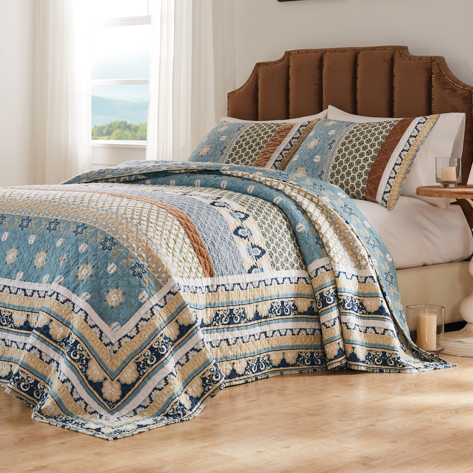 Rows of vivid medallions, stylized florals and geometric prints create distinctive bohemian styling. The Thalia floor-length bedspread set features mitered borders and multi-fabric construction embellished with velvet bands. Reverses to a coordinating updated floral print on a Slate blue ground. Each set comes with floor-length bedspread and two pillow shams. The Queen set comes with two standard pillow shams and the King set comes with two King-sized pillow shams. Pillow shams feature envelope opening on reverse with cloth ties you can use to hold your pillow in place. Dimensions: Queen set includes one 110×118-inch bedspread and two 20×26-inch pillow shams; King set includes one 120×118-inch bedspread and two 20×36-inch pillow shams. All dimensions +/- 2 inches. Face 95% cotton with 5% polyester velvet embellishment; back 100% cotton; fill 60% cotton, 40% polyester. Prewashed for extra softness.